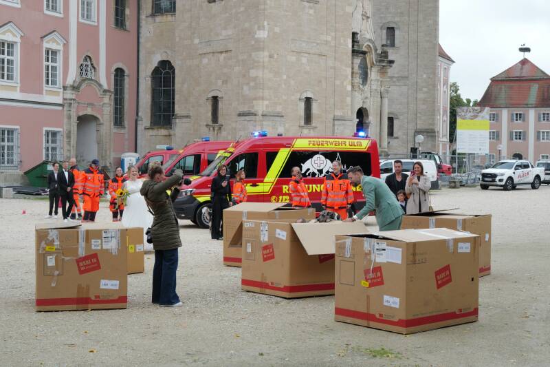 Am 27. September 2025 war es dann soweit und eine "meiner" (gehört natürlich nicht mir) begabtesten Studierenden aus der Frankfurter Zeit an der Carl Remigius Medical School heiratete im wunderschönen Bibliothekssaal des Klosters Wiblingen in Ulm. Ehepartner wurde ein zum Beruf von Lisa Graf passender Notfallsanitäter, Tobias Müller. Mit zur Ehe gehörten von der ersten Minute an zwei Rettungshunde und so stand denn auch die Rettungshundestaffel der Feuerwehr Ulm Spalier, als das frisch vermählte Ehepaar den Bibliothekssaal verliess. Die Hunde sassen alle mucksmäuschenstill und warteten geduldig, bis es soweit war. Einer der Hunde durfte dann sogar noch nach dem Hochzeitsgeschenk der Rettungshundestaffel suchen und wurde recht schnell fündig (nachdem er erst zu den bereit stehenden Häppchen gerannt war).